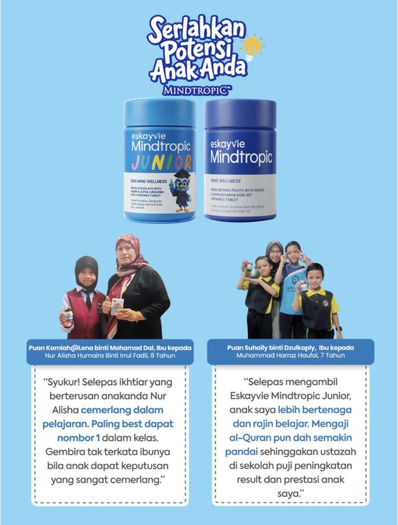 “Dulu selalu rasa stress rasa macam nak bunuh diri, tapi selepas kawan saya perkenalkan Eskayvie Mindtropic ni, saya dah mula kurang stress, tidur pun berkualiti” -Pn Anim, 38 Tahun-