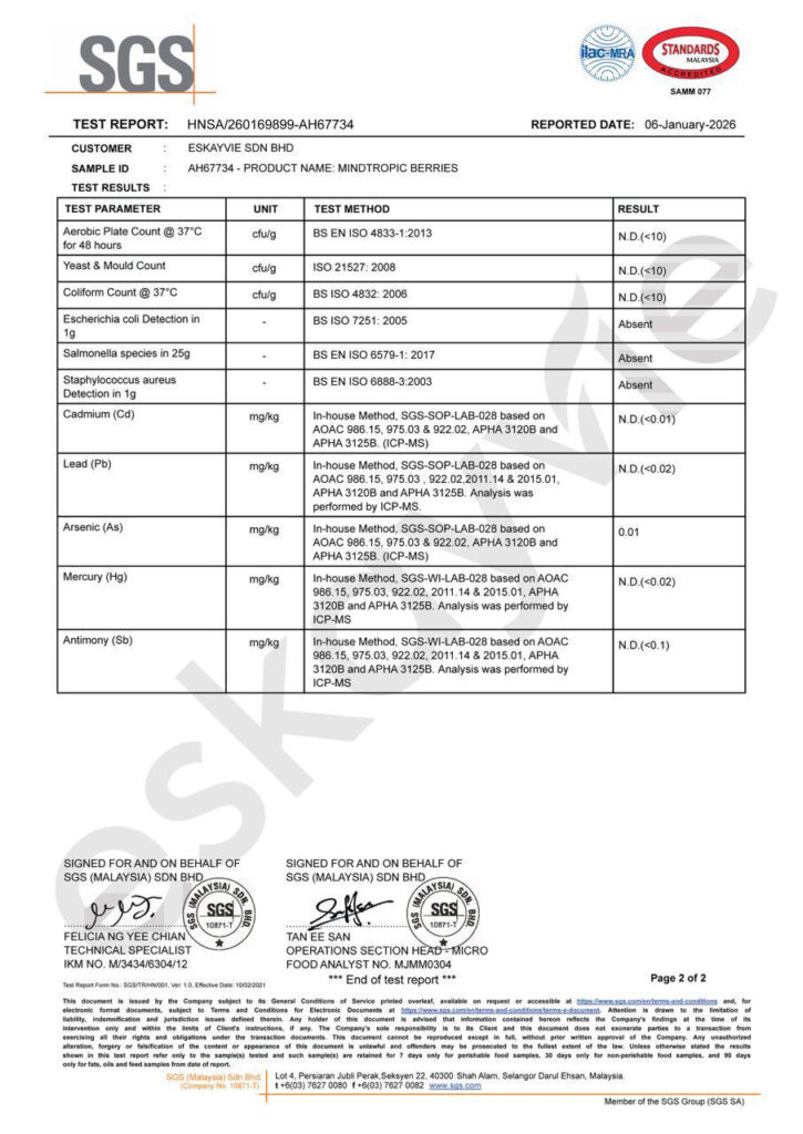 Pengesahan bahawa Eskayvie Mindtropic Selamat Digunakan & Mematuhi Akta Peraturan-peraturan Makanan.