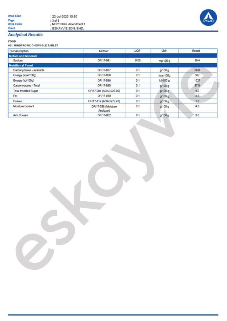Siji Analisis & Pengesahan tentang kandungan serta nutrisi yang akan dimanfaatkan oleh pengguna Eskyavie Mindtropic.